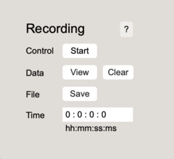 The Start/Stop button starts and stops recording. The view button opens a separate window that displays the recorded data thusfar. The Clear button erases all recorded data from memory and resets the recording time. The Save button opens a dialog to save the recorded data thusfar to a file. The Time indicator shows the duration of the recording in hours, minutes, seconds and milliseconds.